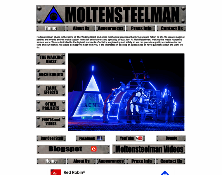 MOLTENSTEELMAN inventor and builder of The Walking Beast, large as a monster truck, this mechanical spider is a Burning man favorite. The studio creates flame-shooting mechanized devices. Designs, engineering and fabrication of metal kinetic sculptures, creative steel projects, and art displays as well. Located in the Oregons Willamette Valley part of the northwest. Their creation has been on the Discovery Channel Canada, MTV and The History Cha...
