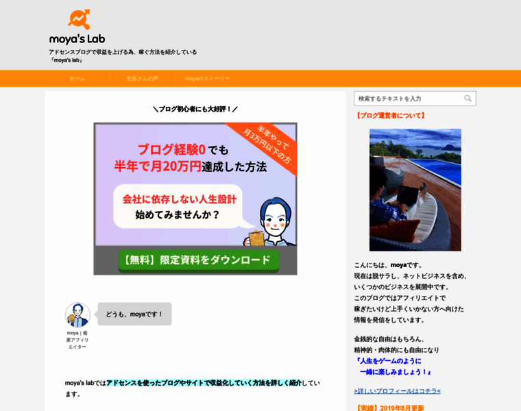 アドセンスブログで収益を上げる為、稼ぐ方法を紹介している『moyas lab』 月3万円ほどの収入から月5万円、月10万以上稼ぐためのサポートをする研究所です。