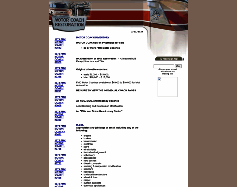 The registrar of motorcoachrestoration.com is Network Solutions, LLC and the name expires on 2025-04-30. According to open source data, you can reach the owner at customerservice@networksolutions.com but please make sure you have a good reason for unsolicited messages. Their country of residence is United States of America.