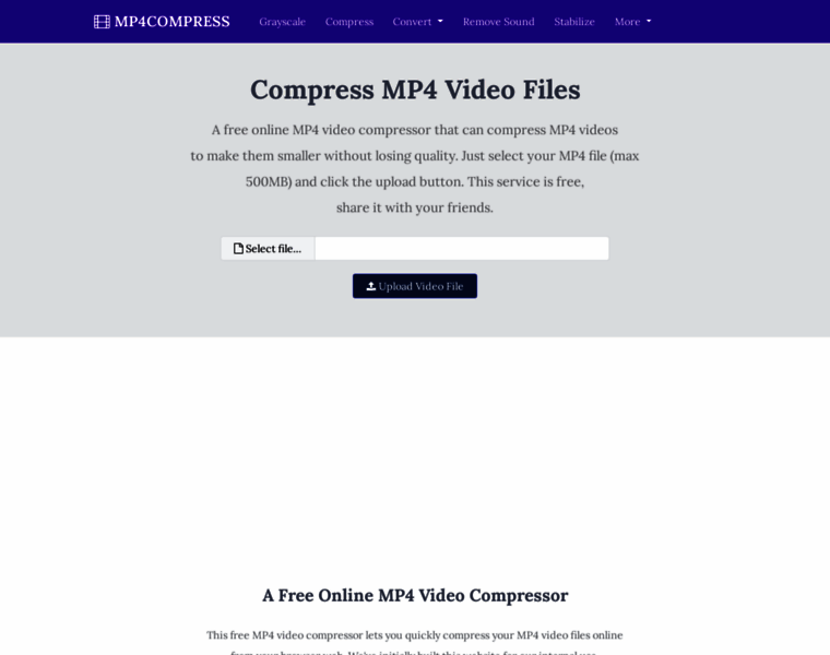 Mp4Compress is a free online MP4 video compressor that can compress MP4 video files to make them smaller without losing quality. Just select your MP4 file (max 500MB) and click the upload button.