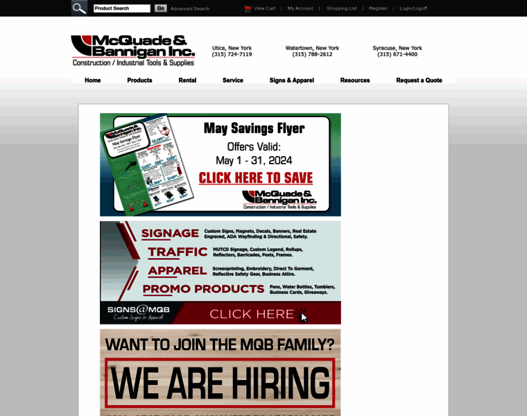 McQuade & Bannigan has been a supplier for the Construction, Industrial & Government Markets since 1907. Our modern facilities in Utica, Watertown and Syracuse are well-stocked with the equipment and supplies you need.