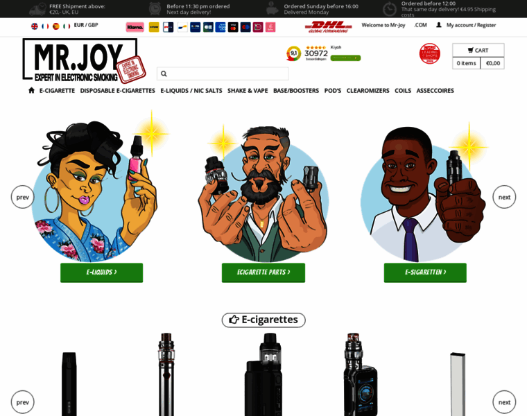 Best and biggest assortment of E-cigarettes and e-liquids, Order before 23:30 next day delivery. Best service in simple e-cigarettes, advanced e-cigarettes and experience e-cigarettes.