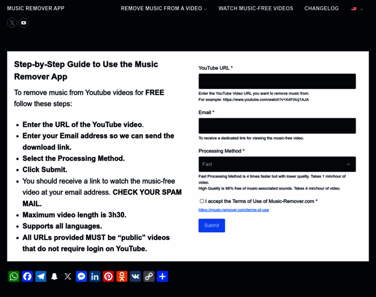 Discover the speed and simplicity of The Music Remover App! Effortlessly mute music from your YouTube videos in just a few clicks. Experience the power of AI processing on your video. Try it now!
