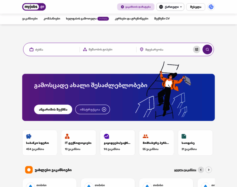 აღმოაჩინეთ ვაკანსიები, დასაქმების შესაძლებლობები და კარიერული განვითარების გზები. მიიღეთ ინფორმაცია ახალ ვაკანსიებზე. შექმენი CV მარტივად და დასაქმდით დღესვე!