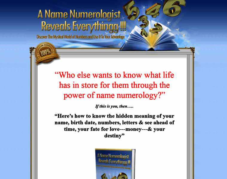 Name Numerology: ?Who else wants to know what life has in store for them through the power of name numerology?? If this is you, then?.. ?Here?s how to know the hidden meaning of your name, birth date, numbers, letters & see ahead of time, your fate for love---money---& your destiny? using numerology and names