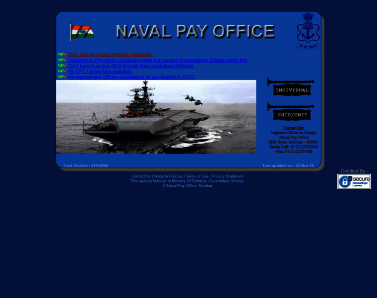 The official website of Naval Pay Office(Indian Navy) under Ministry of Defence , Government of India. All the Indian Navy members can access their pay information at Navpay.gov.in