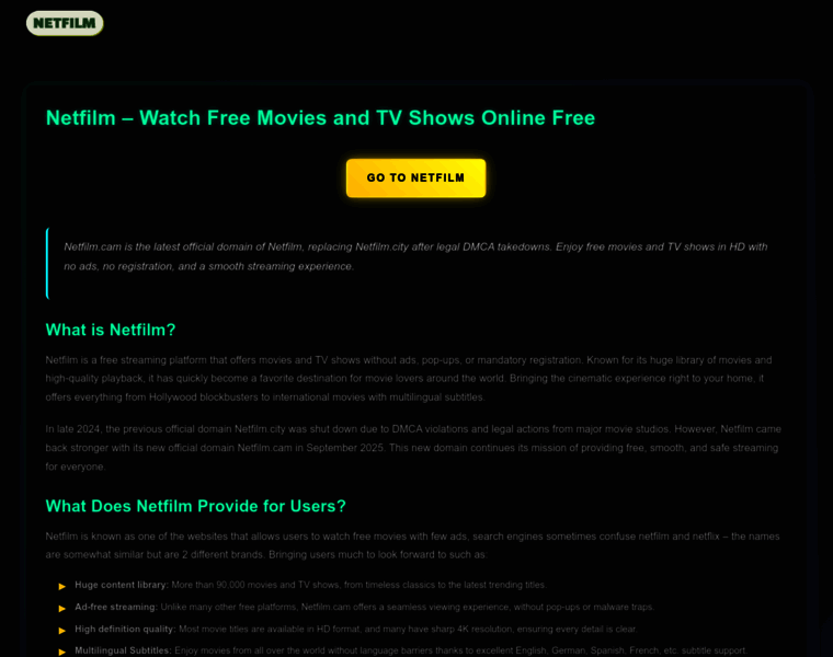 Netfilm's latest official domain is Netfilm.cam, replacing Netfilm.city after it was taken down under DMCA law. Watch free movies and TV shows in HD, no ads.