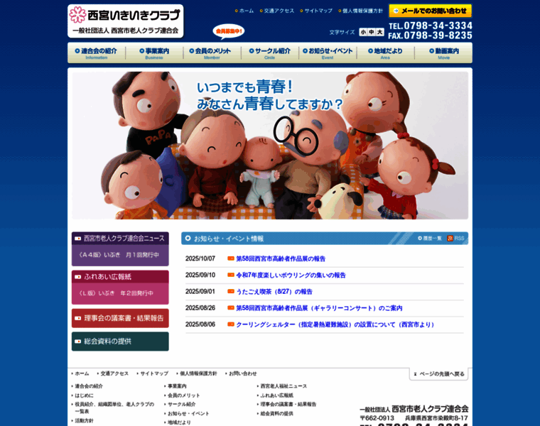 一般社団法人西宮市老人クラブ連合会は、西宮市内の地域住民とりわけ高齢者に対して、保健及び福祉の向上に関する事業として高齢者の介護予防・健康づくりに関する事業を行うとともに、高齢世帯等への安全・見守りのための訪問と子どもの安全のための見守り事業を行い、高齢者及び市民が安心して暮せる地域社会の創設に寄与することを目的としています。