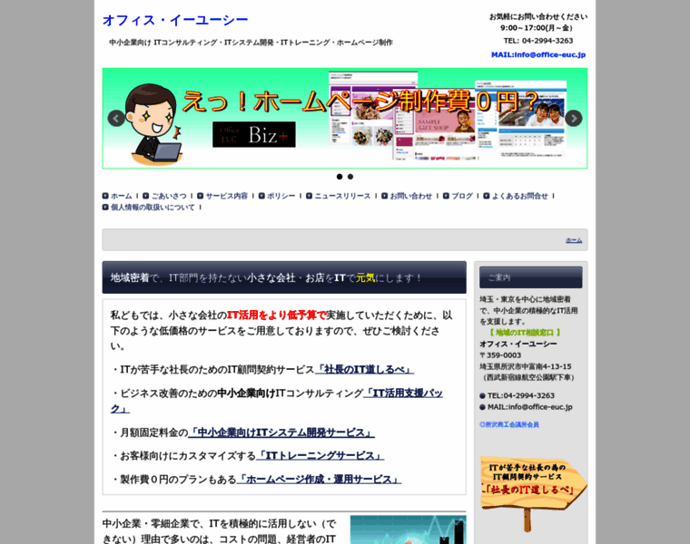 オフィス・イーユーシーは、中小企業・個人事業主様向けに、低予算でのITコンサルティングを中心にしたIT活用支援を通じてビジネスを活性化するお手伝いをしております。弊社は、地域の身近なIT相談窓口を目指しております。どうぞ、お気軽にご相談ください。対応エリア:埼玉・東京・千葉・神奈川