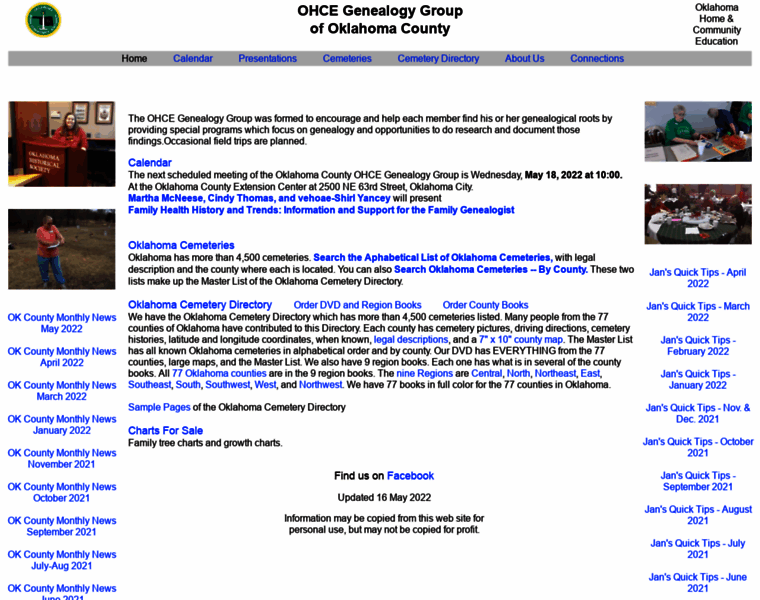 The OHCE Genealogy Group of Oklahoma County has a speaker each month at the Oklahoma History Center. It has the Oklahoma Cemetery Directory.