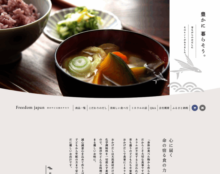 命のやどる食のチカラ。合同会社Freedom japanは、調味料「おかげだし」を播州から全国へ通販でお届けしています。おかげだしは、化学調味料・保存料も無添加のミネラルたっぷりの粉末出汁です。国産加工の安心安全なお出汁です。