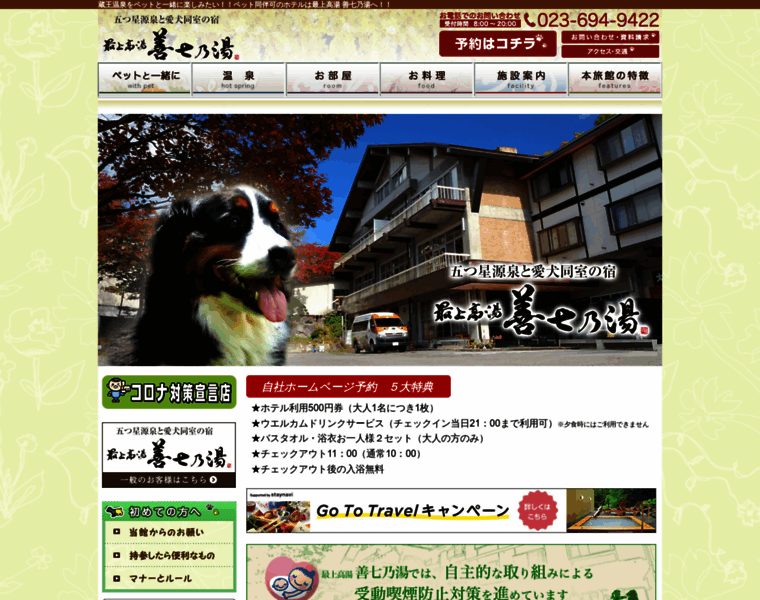 山形県蔵王温泉最上高湯 善七乃湯は蔵王温泉にあるペットと泊まれる温泉宿です。ペット専用の貸切風呂や自家源泉掛け流しの露天風呂があり、ペットと一緒に温泉を楽しめます。