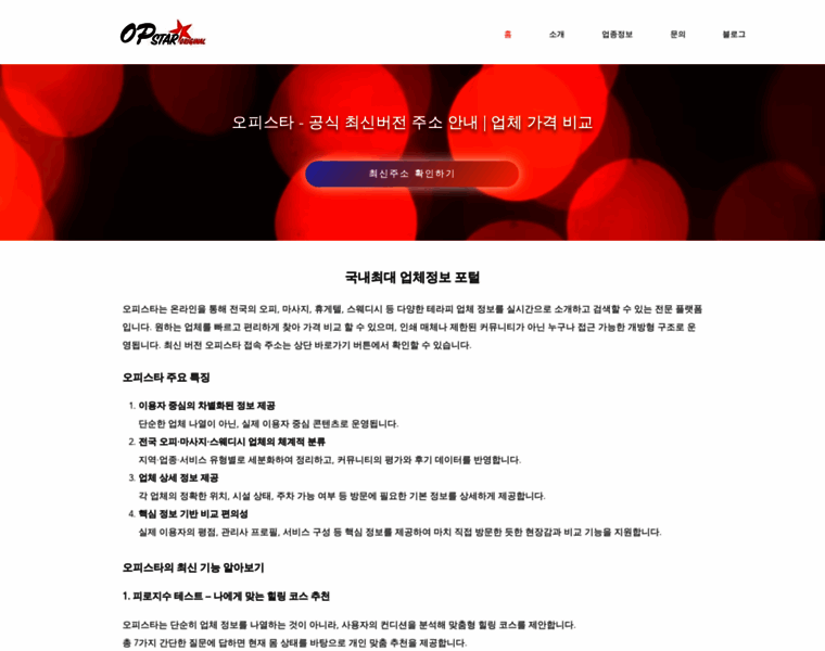 오피스타는 온라인을 통해 전국의 오피, 마사지, 휴게탤, 스웨디시 등 다양한 테라피 업체 정보를 실시간으로 소개하고 검색할 수 있는 전문 플랫폼입니다. 원하는 업체를 빠르고 편리하게 찾아 가격 비교 할 수 있으며, 인쇄 매체나 제한된 커뮤니티가 아닌 누구나 접근 가능한 개방형 구조로 운영됩니다. 최신 버전 오피스타 접속 주소는 상단 바로가기 버튼에서 확인할 수 있습니다.