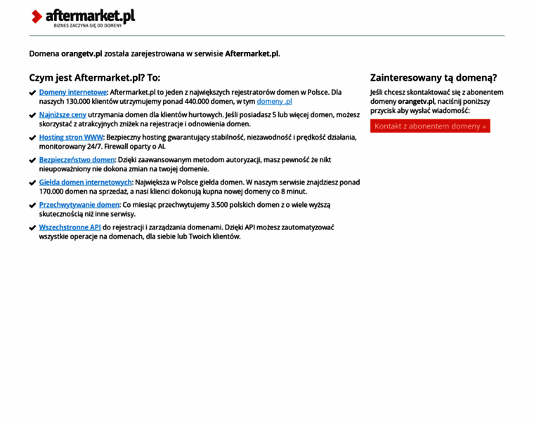 This website is hosted with Aftermarket.pl Limited, which reserves the following IP addresses for orangetv.pl: 185.253.212.22. Moreover, DNS used with this website include ns1.aftermarket.pl, ns2.aftermarket.pl.