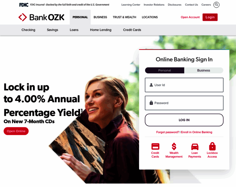 The official site of Bank OZK. We provide our customers an array of top-rated banking solutions: online and mobile banking, checking, savings, business banking solutions, loans, trust and wealth services, and more. Bank OZK, founded in 1903, has more than 240 locations across 8 states. Member FDIC. Equal Housing Lender.