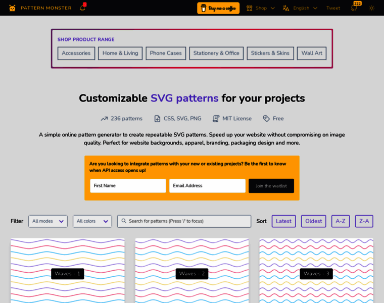 A simple online pattern generator to create repeatable SVG patterns. Perfect for website backgrounds, apparel, branding, packaging design and more.