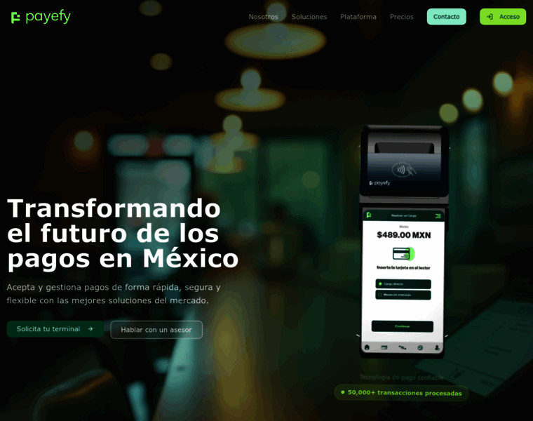 Payefy ofrece terminales de pago (POS), plataforma de gestión en tiempo real y soluciones de e-commerce en México. Acepta tarjetas, SPEI y pagos digitales con las mejores comisiones.
