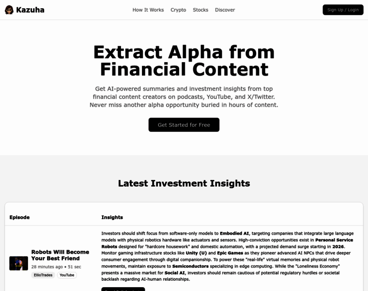 Get AI-powered insights from top financial podcasts, YouTube channels, and X/Twitter accounts. Follow your favorite investment creators and discover key insights from their latest content on stocks, crypto, and trading strategies.