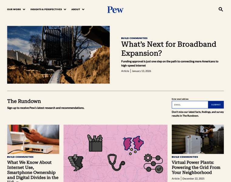 Pew's work lays the foundation for effective policies and practices by invigorating civic life, conducting research, informing and engaging citizens, linking diverse interests to pursue common cause, and insisting on tangible results.