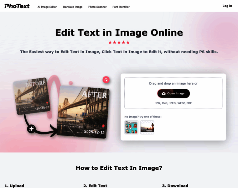 The Easiest way to Edit Text in Image/Screenshot, Click on any Text in Image to Edit it, without needing PS skills, with our AI-Powered Image Text Editor. Support JPG, PNG, JPEG, WEBP, BMP.