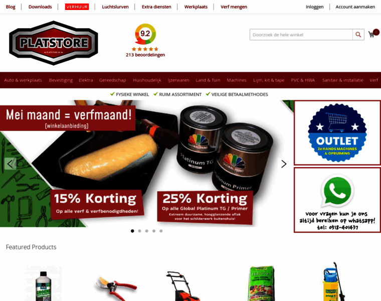 Platstore is uw vakspecialist en webshop voor alle doe-het-zelf artikelen. Een ruim assortiment op het gebied van gereedschap, ijzerwaren, installatiematerialen, bouwmaterialen, verf, PBM, werkkleding, land- en tuinbouw, elektra, elektrische gereedschappen en verlichting.