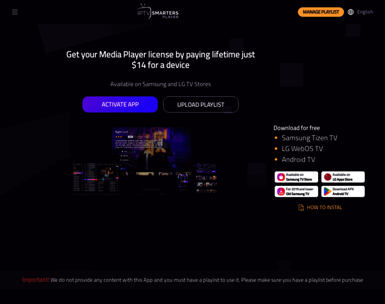 Watch Live TV, Movies, Series with IPTV media player with your own playlist. Find us on Samsung TV and LG TV