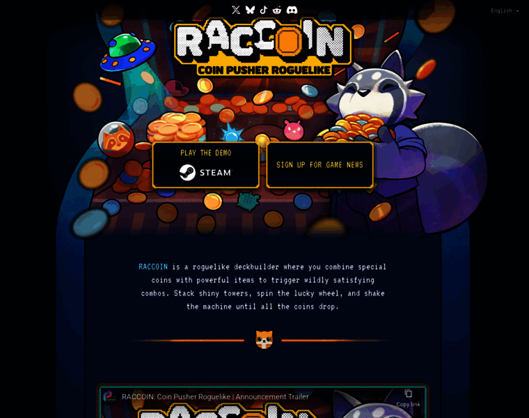RACCOIN is a roguelike deckbuilder where you combine special coins with powerful items to trigger wildly satisfying combos. Stack shiny towers, spin the lucky wheel, and shake the machine until all the coins drop.