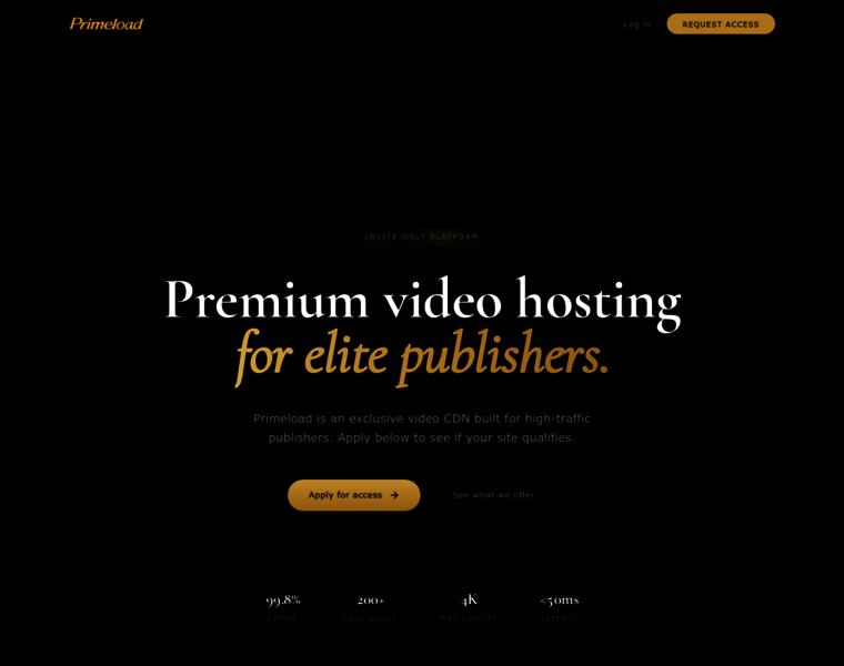 An exclusive video CDN built for high-traffic publishers. HMAC-signed one-time URLs, 200+ edge nodes, 4K streaming, and sub-50ms latency. Apply to see if your site qualifies.