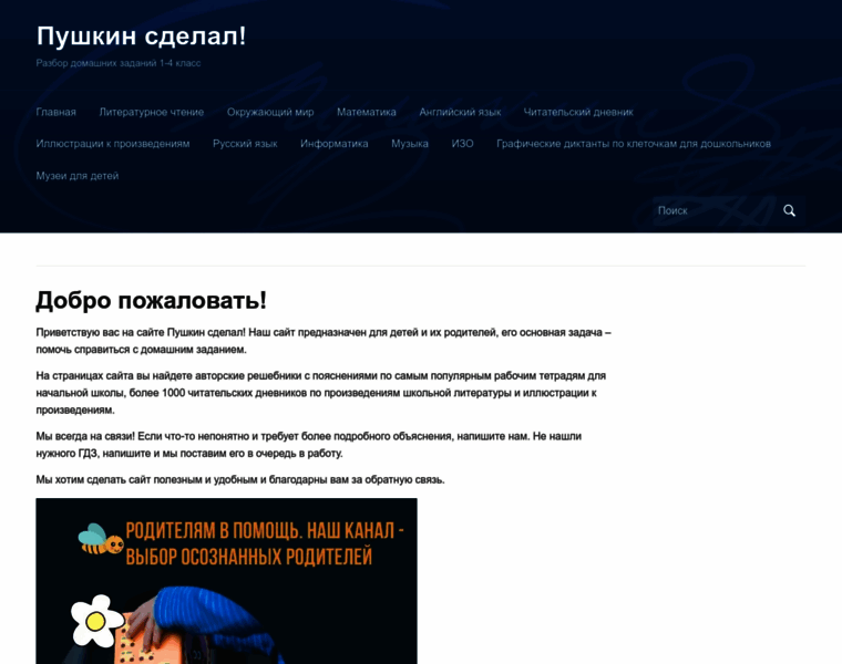 Приветствую вас на сайте Пушкин сделал! Наш сайт предназначен для детей и их родителей, его основная задача - помочь справиться с домашним заданием. На страницах сайта вы найдете авторские решебники с пояснениями по самым популярным рабочим тетрадям для начальной школы, более 1000 читательских дневников по произведениям школьной литературы и иллюстрации к произведениям. Мы всегда на