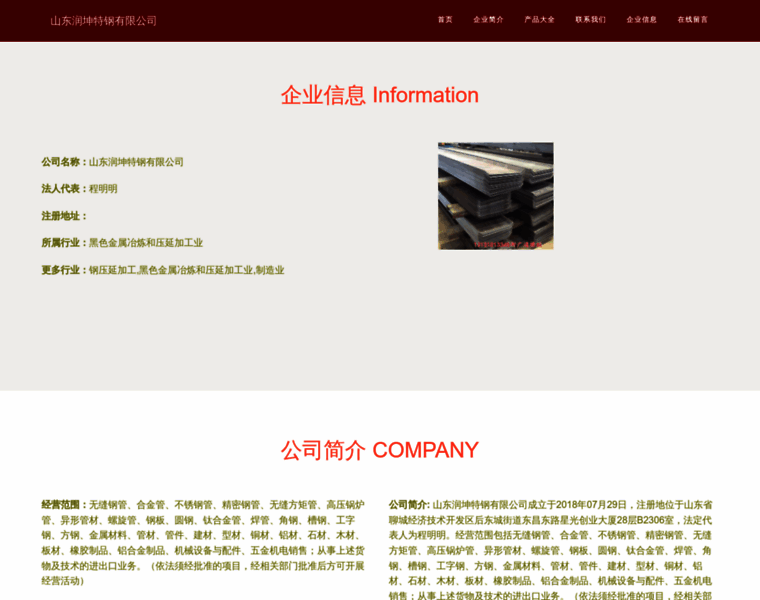 山东润坤特钢有限公司成立于2018年07月29日,注册地位于山东省聊城经济技术开发区东城街道东昌东路星光创业大厦23层B2301室,法定代表人为程萌萌。经营范围包括无缝钢管、合金管、不锈钢管、精密钢管、无缝方矩管、高压锅炉管、异形管材、螺旋管、钢板、圆钢、钛合金管、焊管、角钢、槽钢、工字钢、方钢、金属材料、管材、管件、建材、型材、铜材、铝材、石材、木材、板材、橡胶制品、铝合金制品、机械设备与配件、五金机电销售;从事上述货物及技术的进出口业务。(依法须经批准的项目,经相关部门批准后方可开展经营活动)