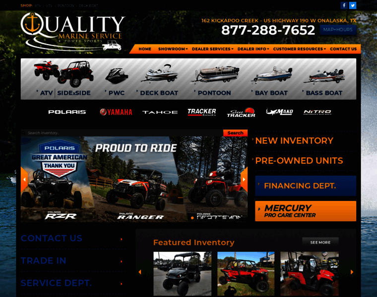 Quality Marine Service is a Marine & Powersports dealership located in Onalaska, TX. We carry the latest Polaris, Yamaha, Tahoe, Tracker Boats, Sun Tracker, Mako and Nitro models, including ATVs, Side x sides, PWC, Pontoons and Boats. We also offer parts, service, and financing near the areas of Houston, College Station, Livingston and Huntsville.