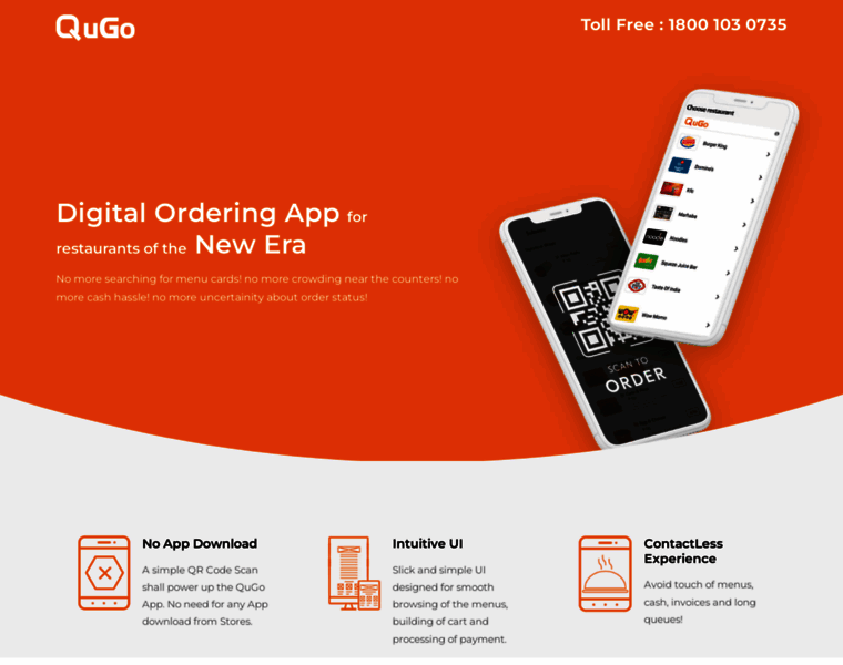QuGo is a Scan-Pay-Go Digital Ordering App for Restaurants which provides a Contactless way of ordering to the users from their Mobile phones through a simple QR-code Scan. QuGo disrupts the Ordering experience for users through features such as Dynamic Recommendation Engine, Offers and Promotions Engine, among others