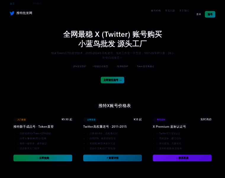 专业推特账号购买平台,提供X(Twitter)美国老号、高权重账号、Token直登号、小蓝鸟账号批发。2015-2024年注册老号,支持2FA安全登录,24小时自动发货。买推特号找源头工厂,售后包赔!