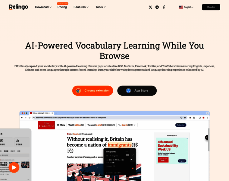 Relingo revolutionizes English vocabulary learning with cutting-edge AI technology. Our intelligent algorithms seamlessly integrate into your daily web browsing and video watching, automatically identifying and highlighting unfamiliar words. Through personalized, context-based learning, Relingo continuously refreshes your memory, expanding your vocabulary without disruption. Experience the power of AI-driven language acquisition as you explore on...