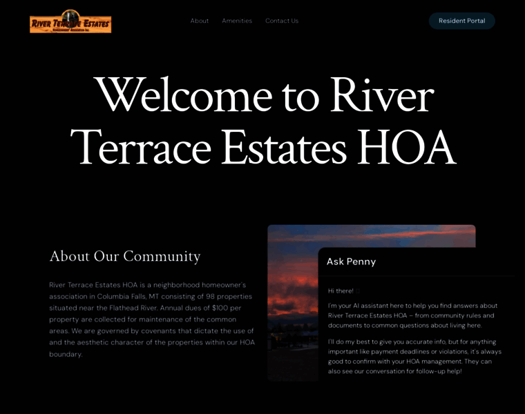 River Terrace Estates HOA is a neighborhood homeowner's association in Columbia Falls, MT consisting of 98 properties situated near the Flathead River. Annual dues of $100 per property are collected for maintenance of the common areas. We are governed by covenants that dictate the use of and the aesthetic character of the properties within our HOA boundary. We use Home-Wise Docs for all resale documentation provided to real estate agencies a...