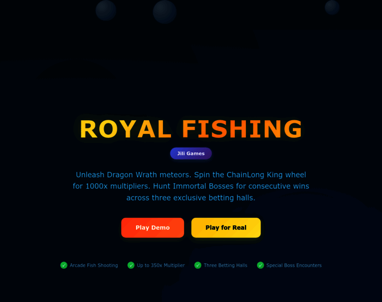 Royal Fishing by Jili Games - Arcade fish shooting with Dragon Wrath attacks, ChainLong King 1000x multiplier wheel, and Immortal Boss consecutive wins. Three betting halls from 0.1 to 100 coins.