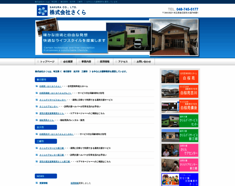 株式会社さくらは、埼玉県《 春日部市 吉川市 三郷市 》を中心に住宅型有料老人ホーム、サービス付き高齢者向け住宅、通所介護、訪問介護、福祉用具貸与、居宅支援事業所、を運営しています。