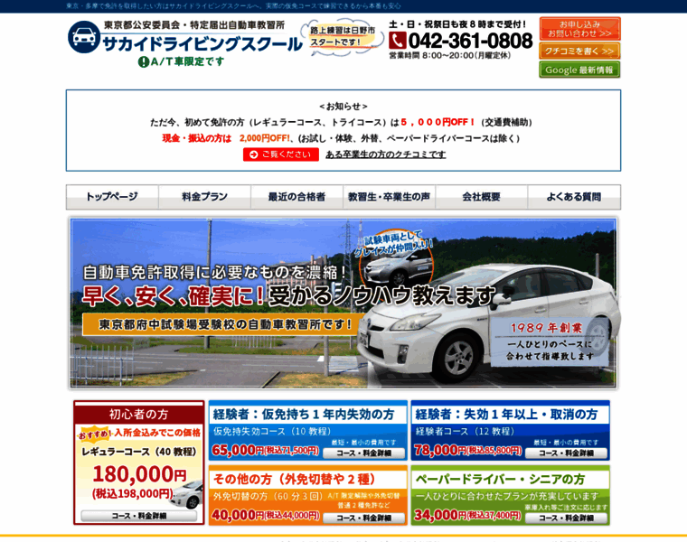 東京の自動車教習所はサカイドライビングスクールへ。多摩・八王子の免許取得希望の方や、失効・取り消しになった方の免許取得だけでなく、ペーパードライバー講習にも対応しています。一人一人に合わせた指導で早く、安く、確実に受かるノウハウをお伝えします。