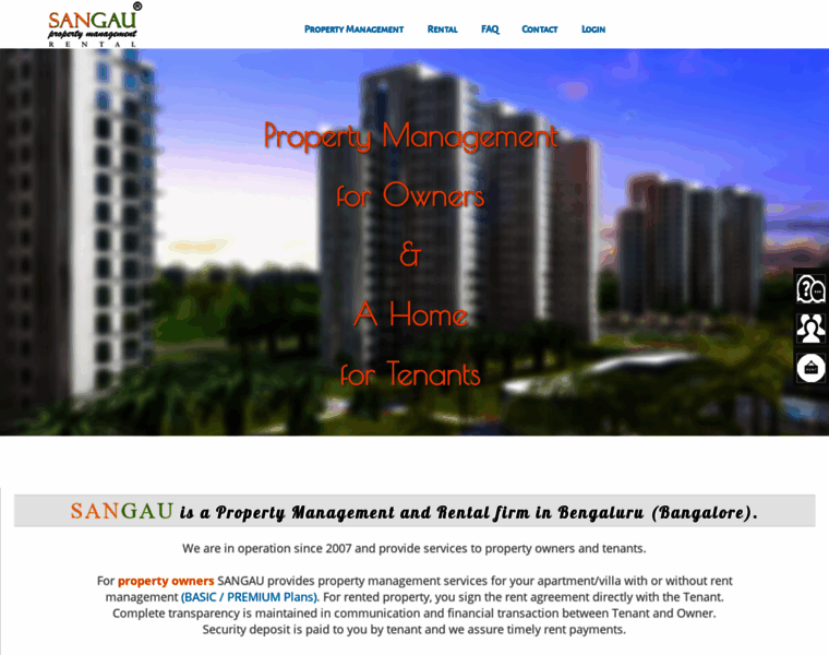 SANGAU is a property management and rental company in Bengaluru(Bangalore). We have been in operation since 2007 and provide services to property owners and tenants.