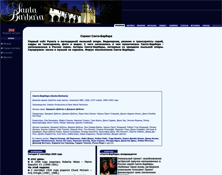 Сериал Санта-Барбара (Santa Barbara) онлайн: все сезоны, все серии. Видеоархив, резюме и транскрипты, фото и видео. Актеры Санта-Барбары, интервью. Саундтреки: песни и музыка из сериала. Форум поклонников Санта-Барбары.