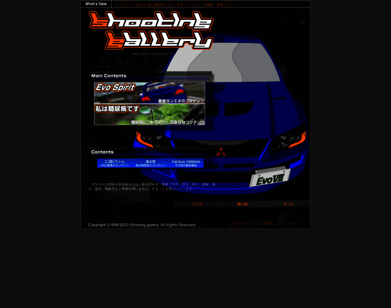 Shooting Gallery(シューティングギャラリー)は、管理人(Goose)の現在乗っているエボⅦ、鉄道趣味(主にJR北海道)をはじめ、その他糖尿病(1型糖尿病でCSII【インスリンポンプ】使用中)についてや、海水魚飼育について、洋楽・邦楽(共に主はメタル)コレクション、鉄道模型など個人趣味のページです。過去に乗っていたエスティマのコンテンツもあります。
