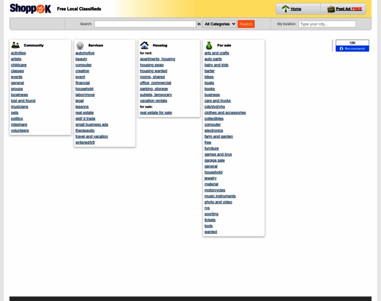 Free Local Shoppok Classifieds. Search and post classified ads in For Sale, Cars, Jobs, Apartments, Housing, Pets, Personals, and other categories.