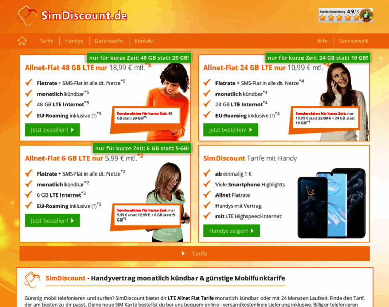 SimDiscount 5G Allnet Flatrates. Handy-Flat ✔ Festnetz-Flat ✔ SMS-Flat ✔ 5G Highspeed Internet ✔ EU-Roaming ✔ monatlich kündbar oder mit Laufzeit