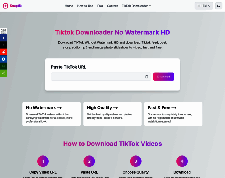 Download TikTok Without Watermark HD and download Tiktok feed, post, story, audio mp3 and image photo slideshow to video, fast and free.