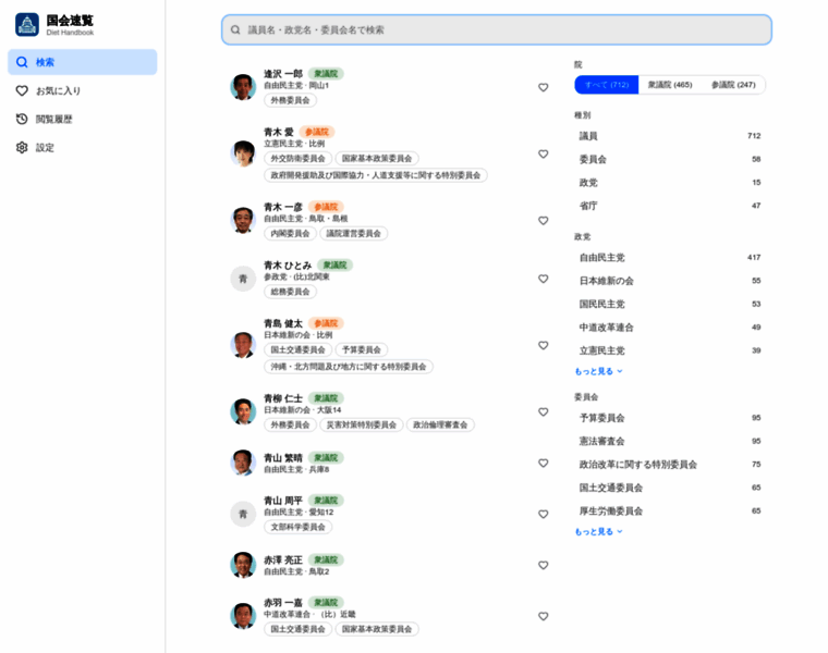 Quickly search and browse profiles, party affiliations, and committee activities of Japanese Diet members. Stay up to date with the latest parliamentary information.