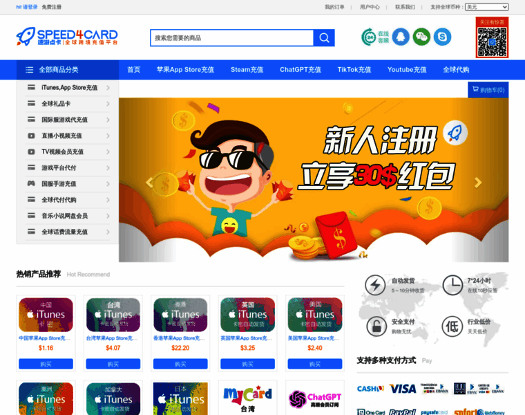 Speed4Card海外充值抖音|苹果APP|Steam|充值海外游戏