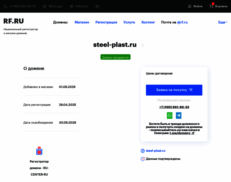 The registrar of steel-plast.ru is RU-CENTER-RU and the name expires on 2026-04-29. Owner email is not available. Their country of residence is Russian Federation.