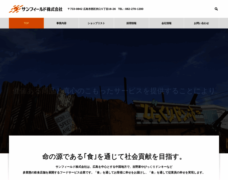 【公式】サンフィールド株式会社 | 吉野家やびっくりドンキーなどのフランチャイズ運営とオリジナルブランド店舗を展開 – 中国地方のフードビジネスをリードし、おいしくリーズナブルな「食」を提供する、食の世界に革命を起こすフィードサービス業です。