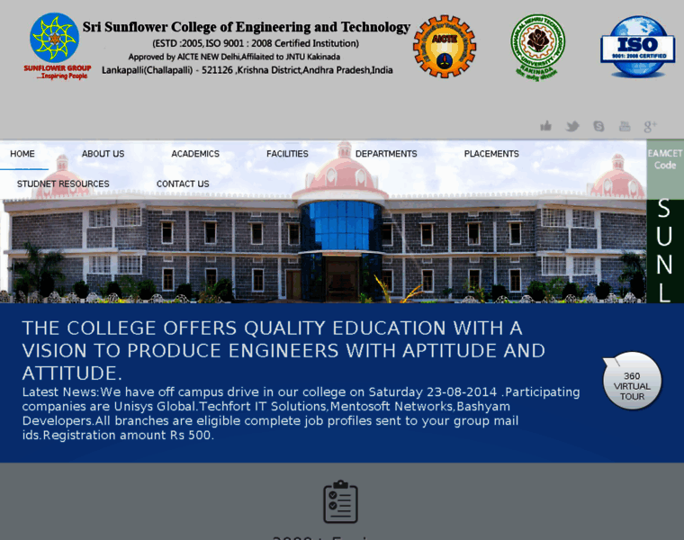 Sri Sunflower college of Engineering and Technology is located at Lankapalli,the college is affiliated to JNTU-Kakinada.Sunflower Engineering college Has Campus wifi with speed of 12 Mbps .The college has bus facility from all the major cities & Towns In and Around Krishna District..The College Is Also Known As SunflowerCET or SSCET..The College EAMCET Code IS