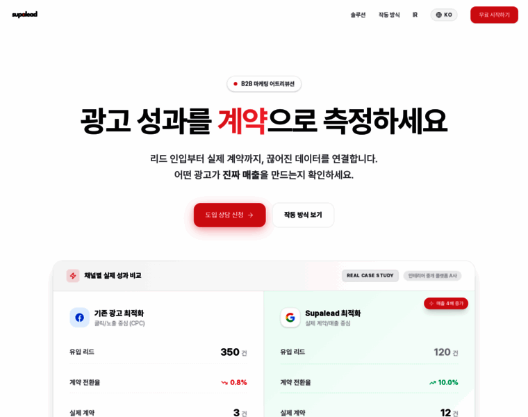 광고 성과를 계약으로 측정하세요. Supalead는 리드부터 매출까지의 끊어진 데이터를 연결하는 B2B 마케팅 어트리뷰션 솔루션입니다.